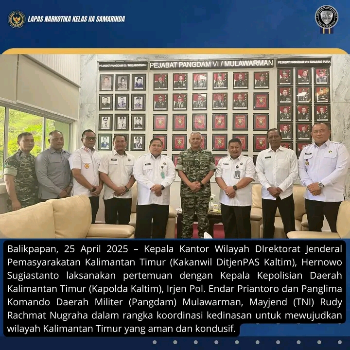 TIMELINES INEWS INVESTIGASI Balikpapan, 25 April 2025 Kepala Kantor Wilayah DIrektorat Jenderal Pemasyarakatan Kalimantan Timur (Kakanwil DitjenPAS Kaltim), Hernowo Sugiastanto laksanakan pertemuan dengan Kepala Kepolisian Daerah Kalimantan Timur (Kapolda Kaltim), Irjen Pol. Endar Priantoro dan Panglima Komando Daerah Militer (Pangdam) Mulawarman, Mayjend (TNI) Rudy Rachmat Nugraha dalam rangka koordinasi kedinasan untuk mewujudkan wilayah Kalimantan Timur yang aman dan kondusif.