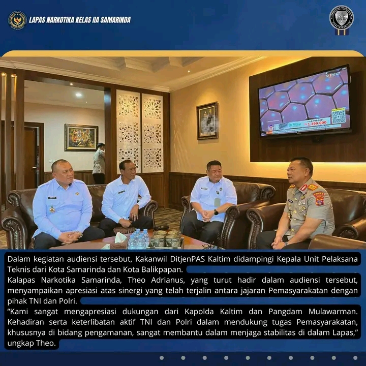 Kalapas Narkotika Samarinda, Theo Adrianus, yang turut hadir dalam audiensi tersebut, menyampaikan apresiasi atas sinergi yang telah terjalin antara jajaran Pemasyarakatan dengan pihak TNI dan Polri.