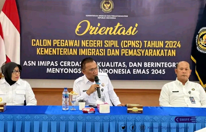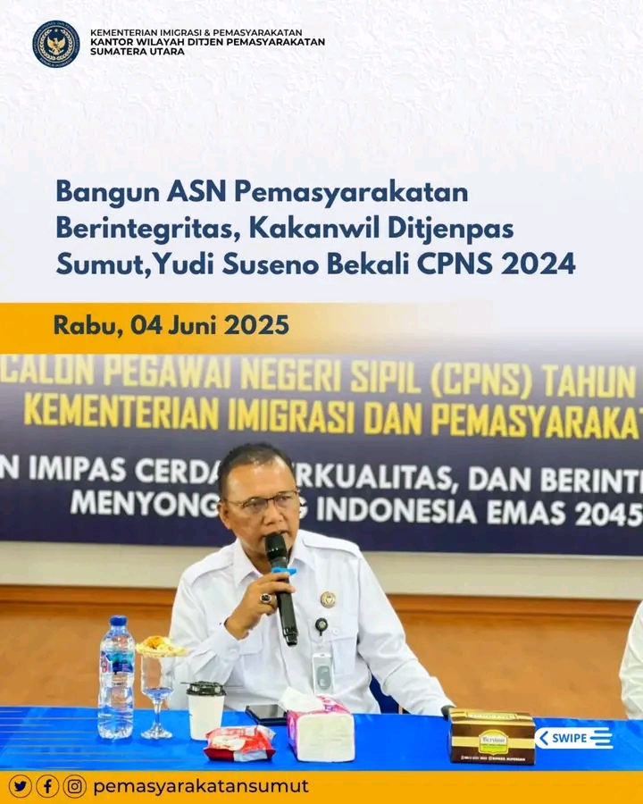 TIMELINES INEWS INVESTIGASI Medan, 4 Juni 2025 Kepala Kantor Wilayah Kementerian Hukum dan HAM Sumatera Utara, Yudi Suseno, menegaskan pentingnya penguatan tugas dan fungsi pemasyarakatan kepada para peserta Orientasi Calon Pegawai Negeri Sipil (CPNS) Tahun 2024 di lingkungan Kanwil Ditjenpas Sumatera Utara. Kegiatan yang berlangsung terpusat di Aula Lembaga Pemasyarakatan (Lapas) Kelas I Medan ini menjadi momentum strategis dalam menanamkan nilai-nilai dasar pemasyarakatan sesuai amanat Undang-Undang Nomor 22 Tahun 2022 tentang Pemasyarakatan.