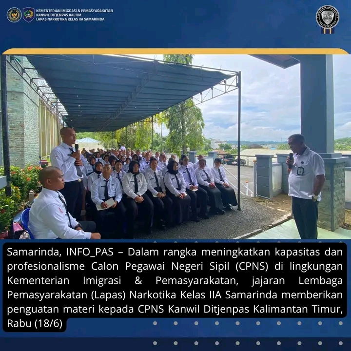 TIMELINES INEWS INVESTIGASI, Samarinda, Dalam rangka meningkatkan kapasitas dan profesionalisme Calon Pegawai Negeri Sipil (CPNS) di lingkungan Kementerian Imigrasi & Pemasyarakatan, jajaran Lembaga Pemasyarakatan (Lapas) Narkotika Kelas IIA Samarinda memberikan penguatan materi kepada CPNS Kanwil Ditjenpas Kalimantan Timur, Rabu (18/6)