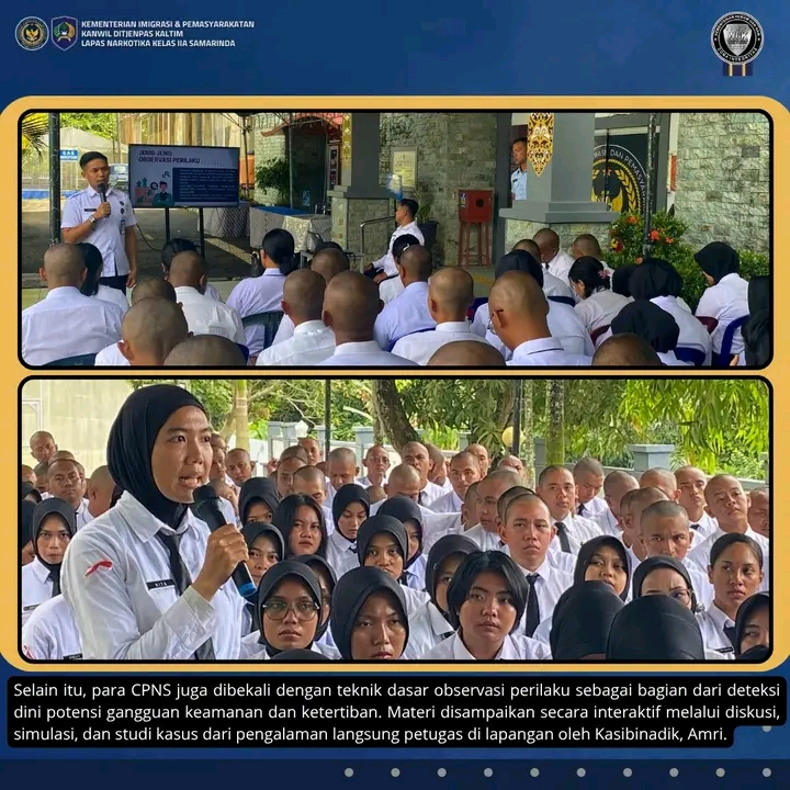 Kegiatan yang berlangsung di Lapas Narkotika Kelas IIA Samarinda ini mengangkat topik “Komunikasi Efektif dan Observasi Perilaku” sebagai bekal penting bagi CPNS dalam menjalankan tugas sebagai petugas pemasyarakatan. Kepala Lapas Narkotika Samarinda melalui pejabat struktural Kasubag Tata Usaha & Kasibinadik menyampaikan bahwa kemampuan berkomunikasi secara efektif, serta kepekaan dalam mengamati perilaku warga binaan, menjadi kunci utama dalam menjaga keamanan dan membina hubungan interpersonal yang sehat di dalam lingkungan pemasyarakatan.