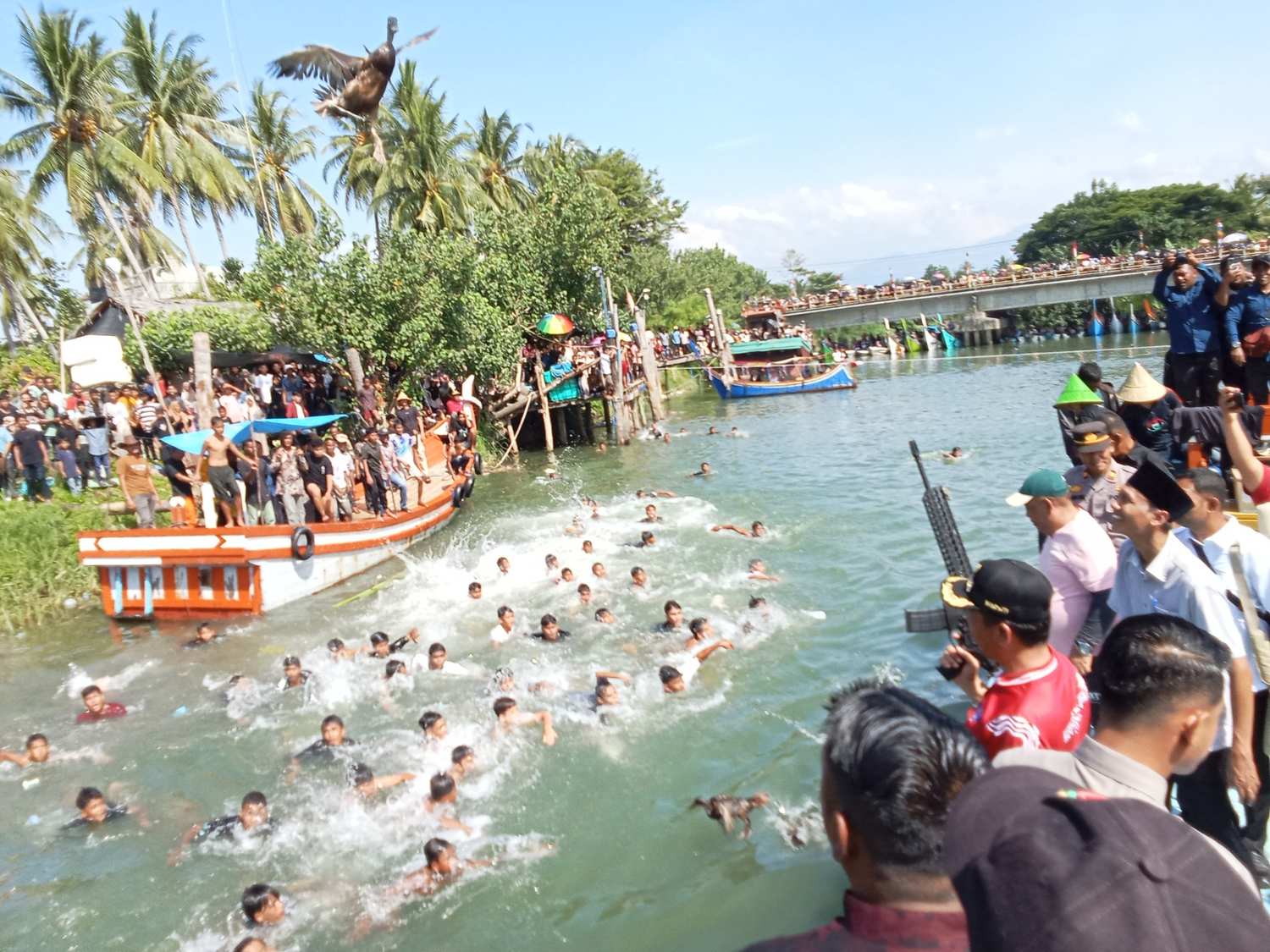 Tak berhenti di situ, gelak tawa warga kembali pecah ketika 80 ekor bebek dilepas ke sungai. Masing-masing bebek sudah diikat dengan uang tunai mulai Rp20 ribu hingga Rp100 ribu di kakinya. Ratusan warga terjun berebut, air memercik ke segala arah, dan jeritan gembira menggema ketika ada yang berhasil menangkap seekor bebek berhadiah. “Siapa yang dapat, itulah rezekinya,” ujar panitia sambil tersenyum.