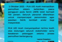 TLii.Banda Aceh, 2 Oktober 2025 – PT PLN (Persero) berhasil memulihkan kembali 100 persen sistem kelistrikan Aceh pada Kamis (2/10) pukul 00.07 WIB yang…