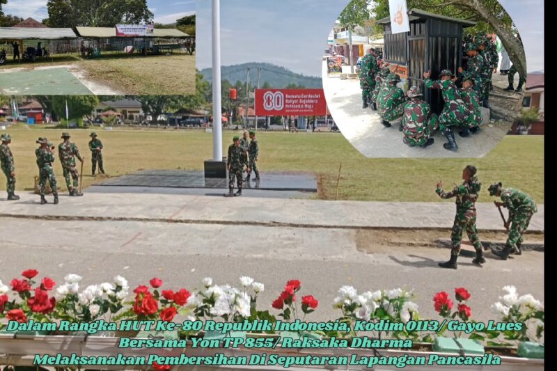 TLii | ACEH | Blangkejeren – Pasi Ops Kodim 0113/ Gayo Lues, Kapten Inf M S Sirait bersama Letda Inf Mustaram pimpin pelaksanaan pembersihan Lapangan Pancasila Kecamatan Blangkejeren Kabupaten Gayo Lues, untuk dipergunakan Upacara HUT Ke-80 Republik Indonesia.