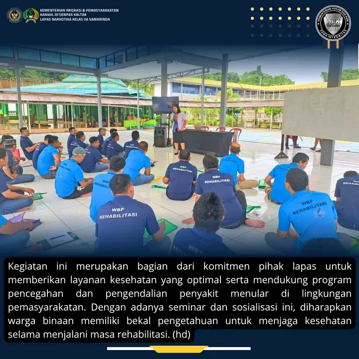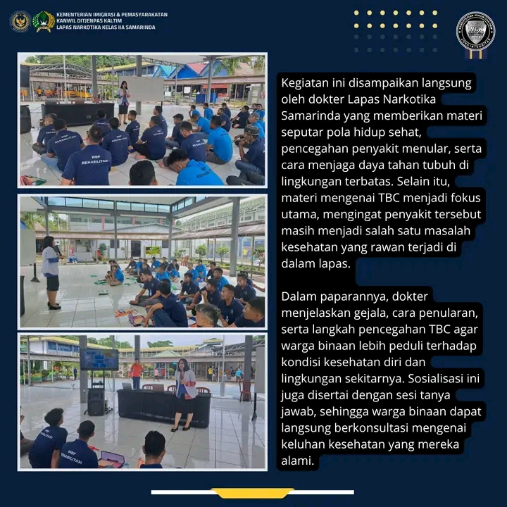 TIMELINES INEWS INVESTIGASI, Samarinda, Dalam upaya meningkatkan pemahaman serta kesadaran akan pentingnya menjaga kesehatan, Lapas Narkotika Kelas IIA Samarinda melalui tenaga medisnya menggelar seminar dan sosialisasi tentang kesehatan fisik dan penyakit Tuberkulosis (TBC) kepada warga binaan program rehabilitasi, Jumat (3/10)