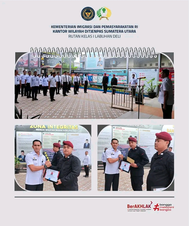 Kegiatan yang berlangsung dengan khidmat tersebut diikuti pejabat struktural, pegawai pengamanan, serta staf Rutan Labuhan Deli. Momen penghargaan semakin hangat ketika kedua pegawai penerima piagam mendapatkan tepuk tangan meriah dari rekan sejawat.