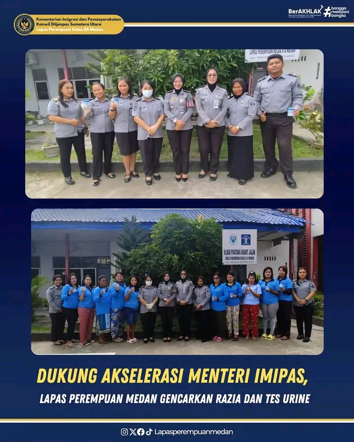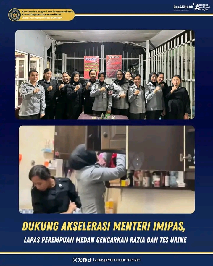 TIMELINES INEWS INVESTIGASI, Medan Lembaga Pemasyarakatan (Lapas) Perempuan Kelas IIA Medan gencarkan razia kamar hunian dan tes urine bagi pegawai dan Warga Binaan Pemasyarakatan (WBP), sebagai bentuk komitmen dalam mendukung program 13 Akselerasi Menteri Imigrasi dan Pemasyarakatan (Menimipas), salah satunya adalah Pemberantasan Narkoba dan Penipuan. Program ini menargetkan pemberantasan peredaran narkoba di lapas dan rutan, guna menciptakan lingkungan pemasyarakatan yang bersih dari narkoba, Selasa (03/06/25)