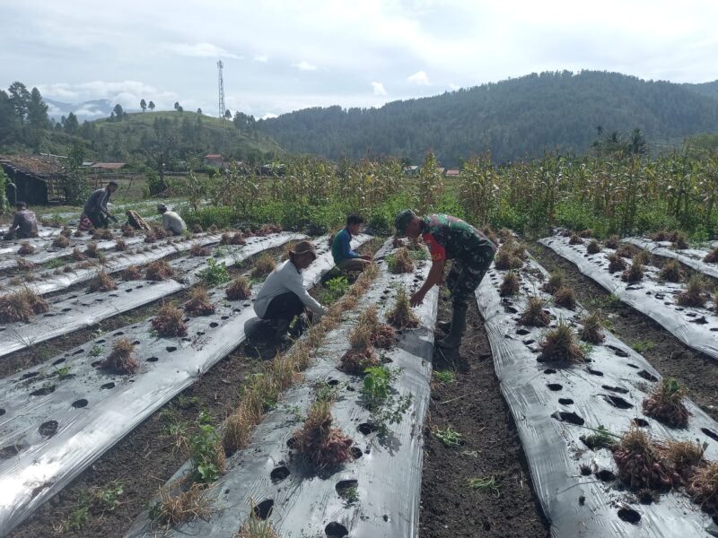 TLii | Aceh | Gayo Lues – Serka Sukino Babinsa Posramil Dabungelang Koramil 03/Blangkejeren Kodim 0113/Gayo Lues memberikan dukungan kepada petani yang sedang panen bawang merah di Desa Panglime linting Kecamatan Dabungelang, Kabupaten Gayo Lues, Rabu (17/09/2025).
