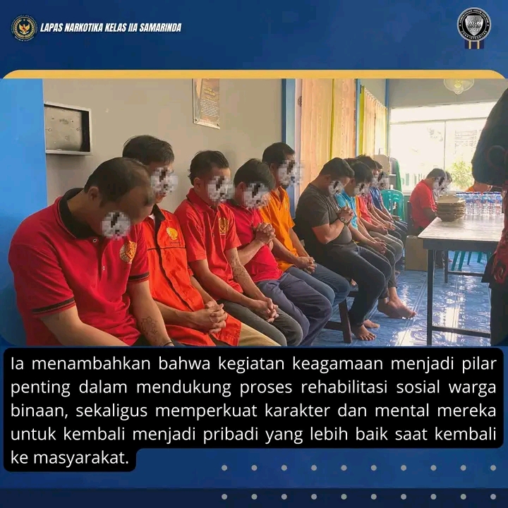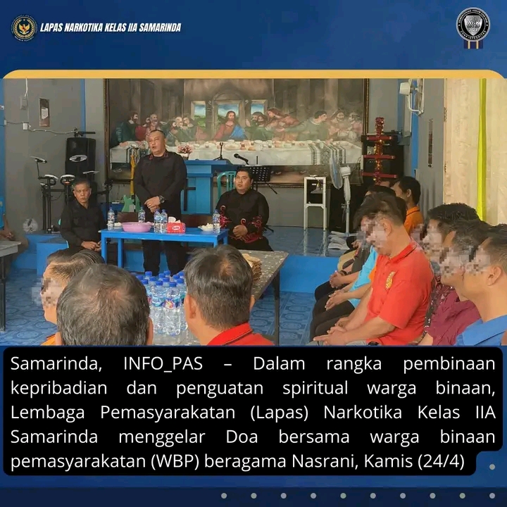 TIMELINES INEWS INVESTIGASI   Samarinda, Dalam rangka pembinaan kepribadian dan penguatan spiritual warga binaan, Lembaga Pemasyarakatan (Lapas) Narkotika Kelas IIA Samarinda menggelar Doa bersama warga binaan pemasyarakatan (WBP) beragama Nasrani, Kamis (24/4)