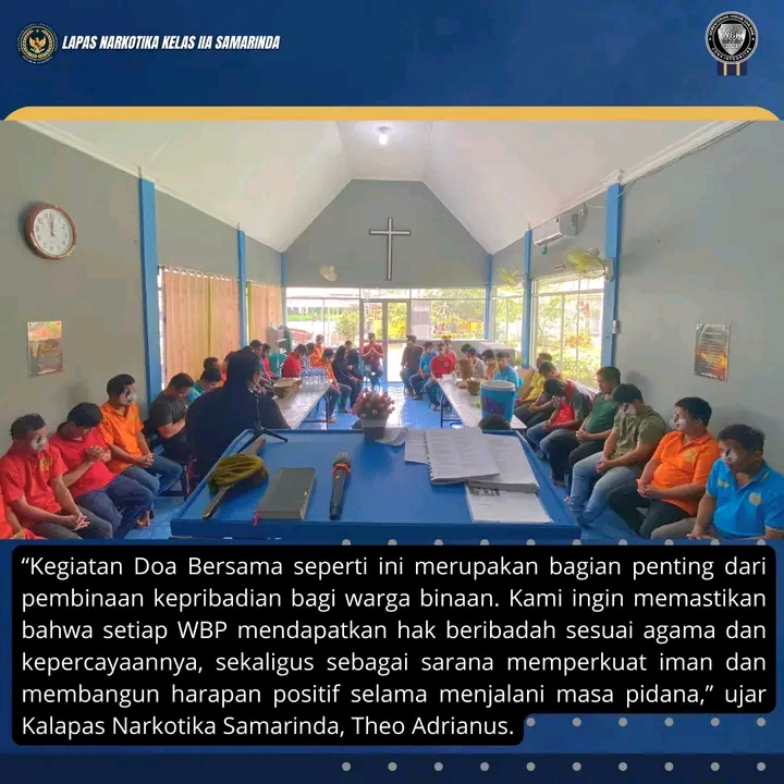 “Kegiatan Doa Bersama seperti ini merupakan bagian penting dari pembinaan kepribadian bagi warga binaan. Kami ingin memastikan bahwa setiap WBP mendapatkan hak beribadah sesuai agama dan kepercayaannya, sekaligus sebagai sarana memperkuat iman dan membangun harapan positif selama menjalani masa pidana,” ujar Kalapas Narkotika Samarinda, Theo Adrianus.