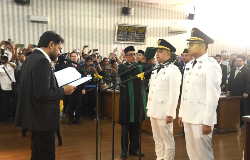 Kota Langsa – Pengambilan Sumpah Jabatan dan Pelantikan Jeffry Sentana S Putra, SE, dan Muhammad Haikal Alfisyahrin, ST, sebagai Walikota dan Wakil Walikota Langsa periode 2025-2030 oleh Gubernur Aceh H. Muzakir Manaf melalui Rapat Paripurna Istimewa DPRK Langsa, Jum’at 23 Mei 2025.