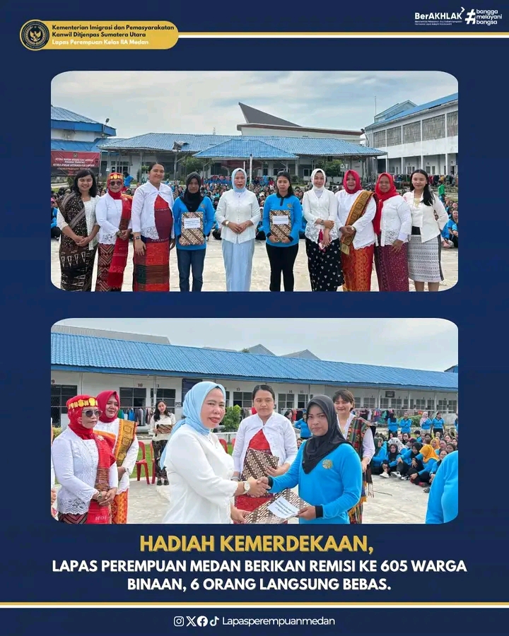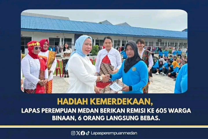 TIMELINES INEWS INVESTIGASI, Medan Lembaga Pemasyarakatan (Lapas) Perempuan Medan memberikan remisi kepada 605 warga binaan pada peringatan Hari Ulang Tahun (HUT) ke-80 Republik Indonesia. Kepala Lapas Perempuan Medan, Yekti Apriyanti, menjelaskan dari jumlah tersebut, sebanyak 7 narapidana dinyatakan bebas. Minggu (17/08)