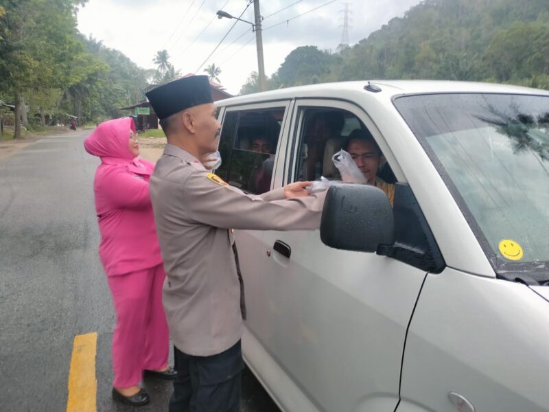 TLii | SUMUT | MUARA SIPONGI | Dalam rangka menyemarakkan bulan suci Ramadhan 1446 H Kapolsek Muara Sipongi AKP Irwan Sastra Dinata beserta anggota dan Ketua Bhayakari Ranting Muara Sipongi NY. Sri Irwan Sastra Dinata beserta anggota Bhayangkari Ranting Polsek Muara Sipongi melaksanakan kegiatan berbagi takjil untuk berbuka puasa kepada masyarakat pengguna jalan maupun masyarakat musafir yang melintas dalam perjalanan, Rabu (12/03/2025) pukul 17.30 Wib.