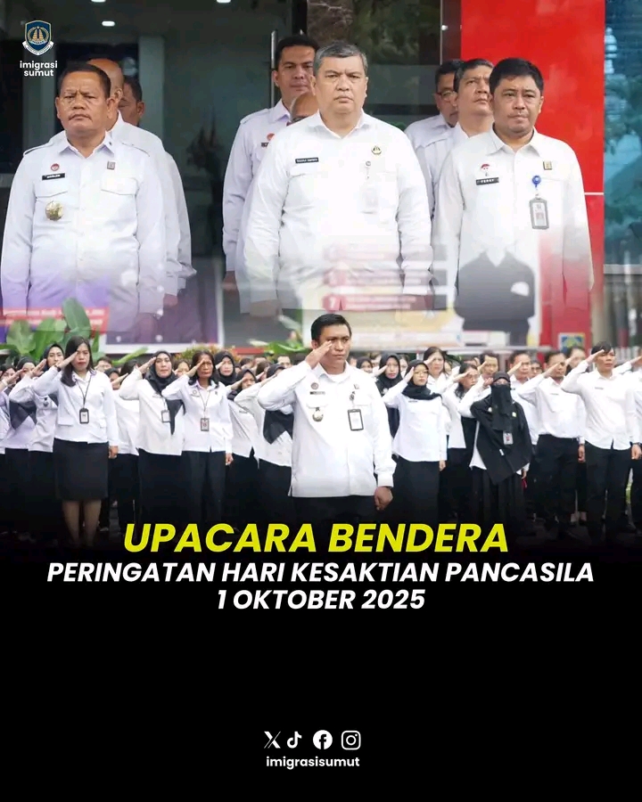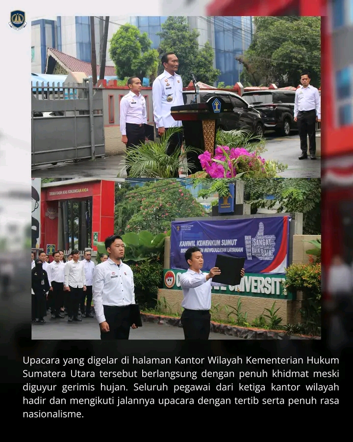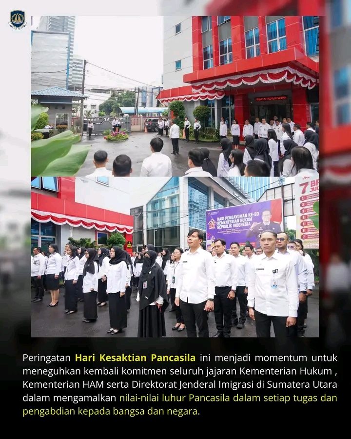 TIMELINES INEWS INVESTIGASI, Medan, 01 Oktober 2025 Dalam rangka memperingati Hari Kesaktian Pancasila, tiga kantor wilayah di Sumatera Utara, yakni Kantor Wilayah Kementerian Hukum dan HAM Sumatera Utara, Kantor Wilayah Direktorat Jenderal Imigrasi Sumatera Utara, serta Kantor Wilayah Kementerian HAM Sumatera Utara, melaksanakan Upacara Bendera bersama pada Rabu (1/10) di halaman Kanwil Kemenkumham Sumut.