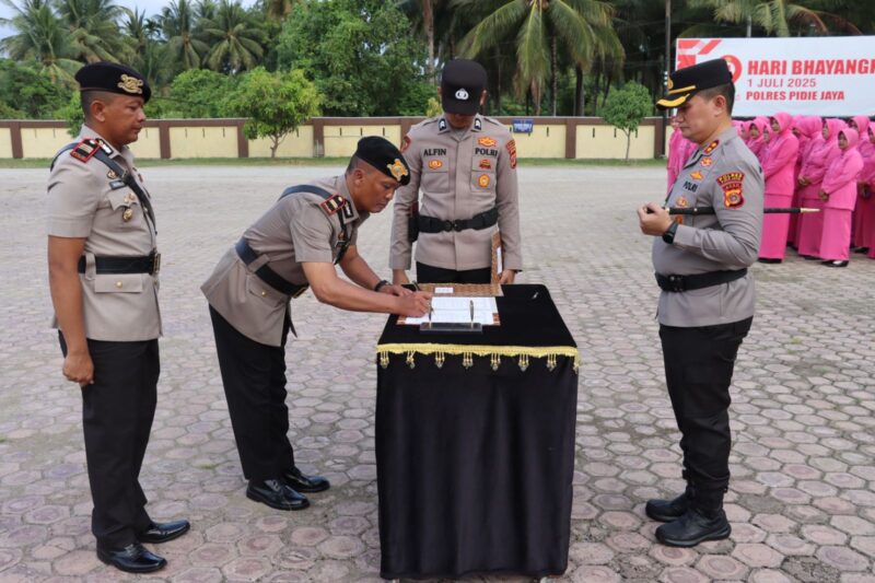 TLii >> Pidie Jaya – Polres Pidie Jaya menggelar upacara serah terima jabatan (sertijab) sejumlah pejabat utama di Mapolres setempat, Sabtu (2/8/2025). Sertijab ini dipimpin langsung oleh Kapolres Pidie Jaya, AKBP Ahmad Faisal Pasaribu, S.H., S.I.K., M.H.