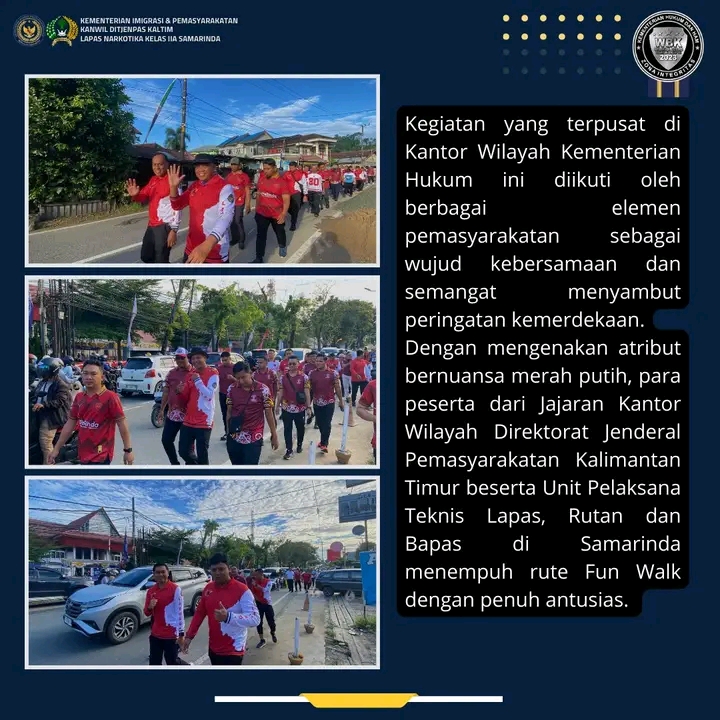 Dengan mengenakan atribut bernuansa merah putih, para peserta dari Jajaran Kantor Wilayah Direktorat Jenderal Pemasyarakatan Kalimantan Timur beserta Unit Pelaksana Teknis Lapas, Rutan dan Bapas di Samarinda menempuh rute Fun Walk dengan penuh antusias.
