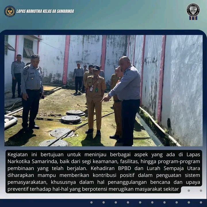 Kegiatan ini bertujuan untuk meninjau berbagai aspek yang ada di Lapas Narkotika Samarinda, baik dari segi keamanan, fasilitas, hingga program-program pembinaan yang telah berjalan. Kehadiran BPBD dan Lurah Sempaja Utara diharapkan mampu memberikan kontribusi positif dalam penguatan sistem pemasyarakatan, khususnya dalam hal penanggulangan bencana dan upaya preventif terhadap hal-hal yang berpotensi merugikan masyarakat sekitar.