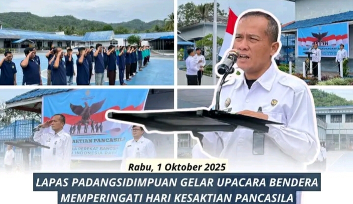 TIMELINES INEWS INVESTIGASI, Padangsidimpuan, Rabu 01 Oktober 2025 Lembaga Pemasyarakatan (Lapas) Padangsidimpuan menggelar upacara bendera khidmat pada pagi ini untuk memperingati Hari Kesaktian Pancasila. Kegiatan yang dimulai tepat pukul 08.00 WIB ini berlangsung di lapangan multiguna Lapas Padangsidimpuan dan dihadiri oleh seluruh pejabat, pegawai, petugas keamanan, serta warga binaan pemasyarakatan. Rabu (1/10/2025).