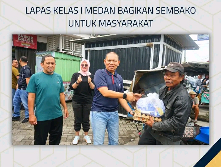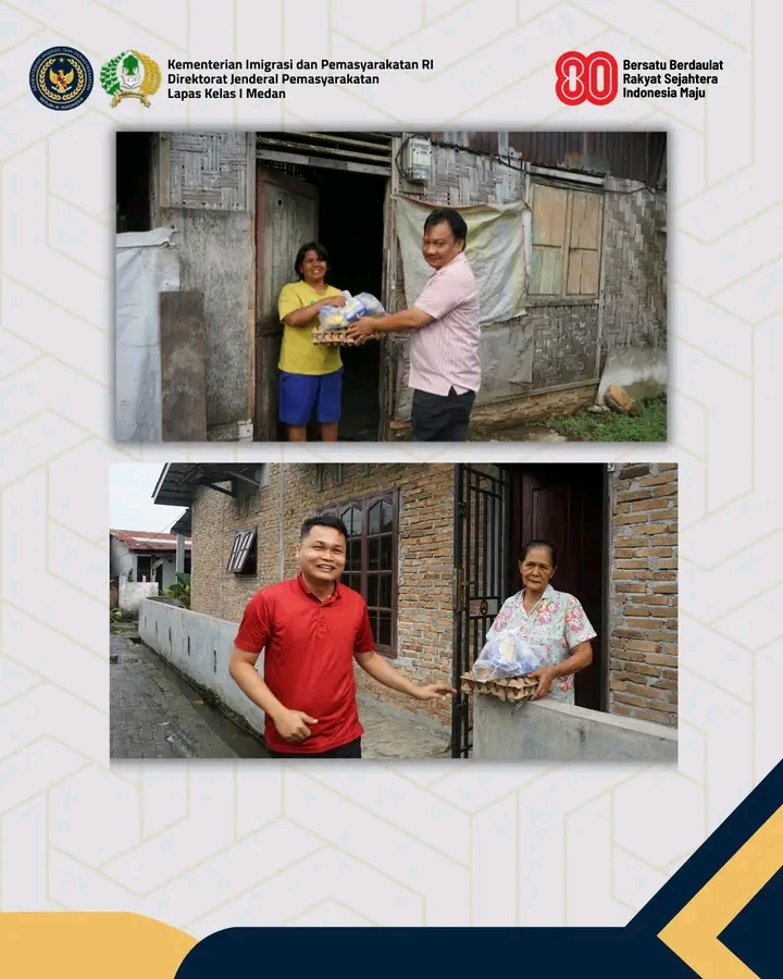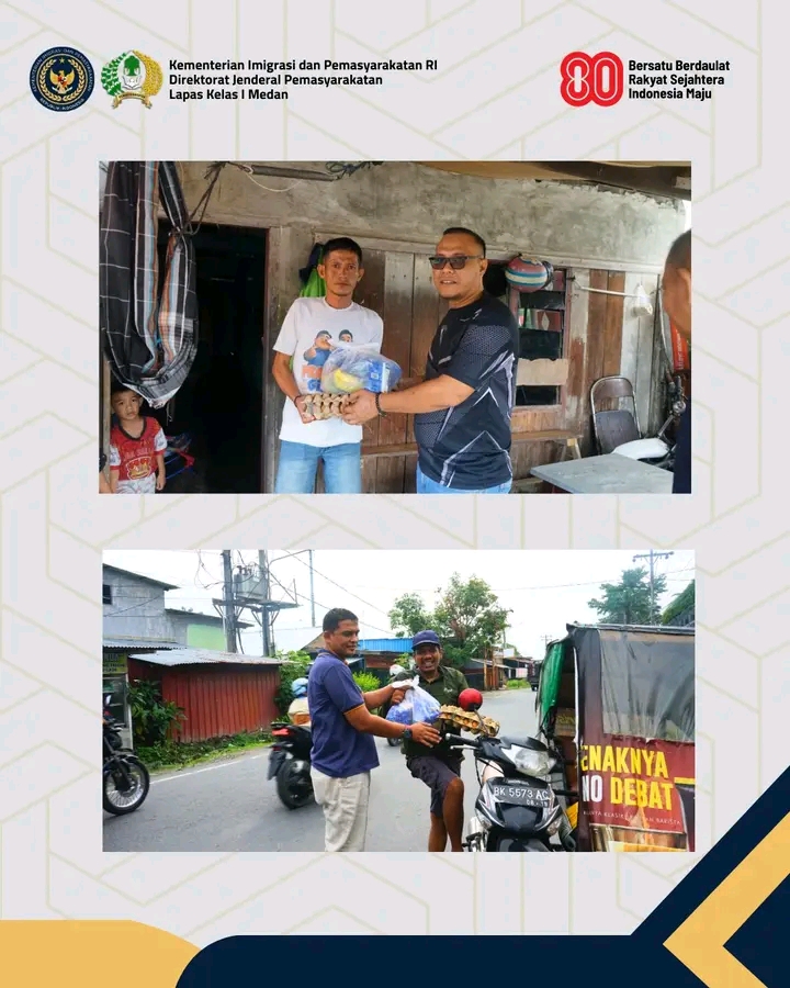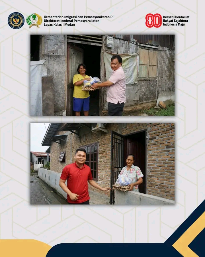 TIMELINES INEWS INVESTIGASI, Medan Dalam rangka menyongsong peringatan Hari Ulang Tahun (HUT) Kemerdekaan Republik Indonesia ke-80, Lembaga Pemasyarakatan (Lapas) Kelas I Medan melaksanakan kegiatan sosial berupa pembagian paket sembako kepada masyarakat sekitar. Kegiatan ini dipimpin langsung oleh Kepala Lapas Kelas I Medan, Herry Suhasmin, bersama jajaran pegawai yang turun langsung menyambangi rumah-rumah warga.