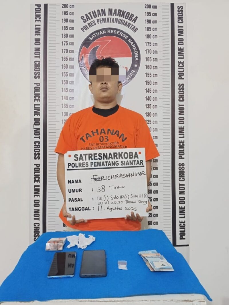 TLii|SUMUT|SIANTAR|Polres Pematangsiantar Melalui Sat res Narkoba Berhasil menangkap seorang laki laki berinisial FCS (35) warga Jalan Merbau Kelurahan Kahean Kecamatan Siantar Utara Kota Pematangsiantar memiliki narkotika jenis sabu berat bruto 1.56 Gram di pinggir Jalan Gotong Royong Kelurahan Kahean Kecamatan Siantar Utara Kota Pematangsiantar, pada Senin 11 Agustus 2025 malam sekira pukul 21.20 WIB.