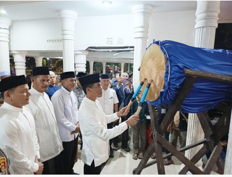 Pj Walikota Langsa memukul tambo saat melepas peserta Pawai Takbir di Podium Lapangan Merdeka (Foto : Timelineinews.com)