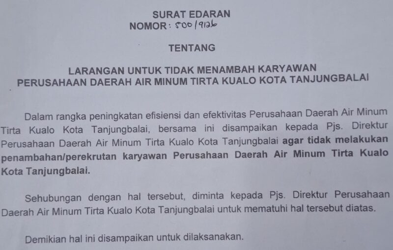 Surat edaran nomor 500/9126 tentang larangan untuk tidak menambah karyawan Perusahaan Daerah Air Minum (PDAM) Tirta Kualo Kota Tanjungbalai yang ditandatangani Wali Kota Tanjungbalai, Mahyaruddin Salim B tanggal 28 Mei 2025 menjelaskan bahwa dalam rangka peningkatan efisiensi dan efektifitas PDAM Tirta Kualo meminta agar Pjs. Direktur PDAM Tirta Kualo Kota Tanjungbalai agar tidak melakukan penambahan/perekrutan karyawan Perusahaan Daerah Air Minum Tirta Kualo Kota Tanjungbalai, jelas Rini
