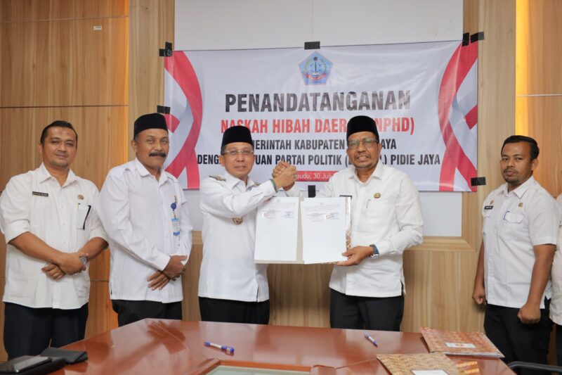 TLii >> MEUREUDU – Pemerintah Kabupaten Pidie Jaya menandatangani Naskah Perjanjian Hibah Daerah (NPHD) terkait Bantuan Keuangan untuk Partai Politik (Parpol), Rabu (29/7/2025), bertempat di Ruang Rapat Bupati Pidie Jaya.
