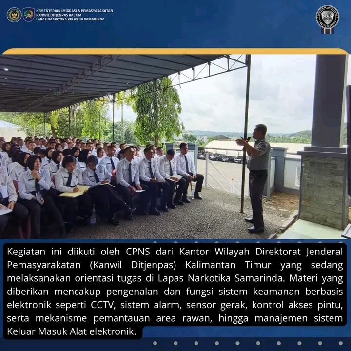 Kegiatan ini diikuti oleh CPNS dari Kantor Wilayah Direktorat Jenderal Pemasyarakatan (Kanwil Ditjenpas) Kalimantan Timur yang sedang melaksanakan orientasi tugas di Lapas Narkotika Samarinda. Materi yang diberikan mencakup pengenalan dan fungsi sistem keamanan berbasis elektronik seperti CCTV, sistem alarm, sensor gerak, kontrol akses pintu, serta mekanisme pemantauan area rawan, hingga manajemen sistem Keluar Masuk Alat elektronik.