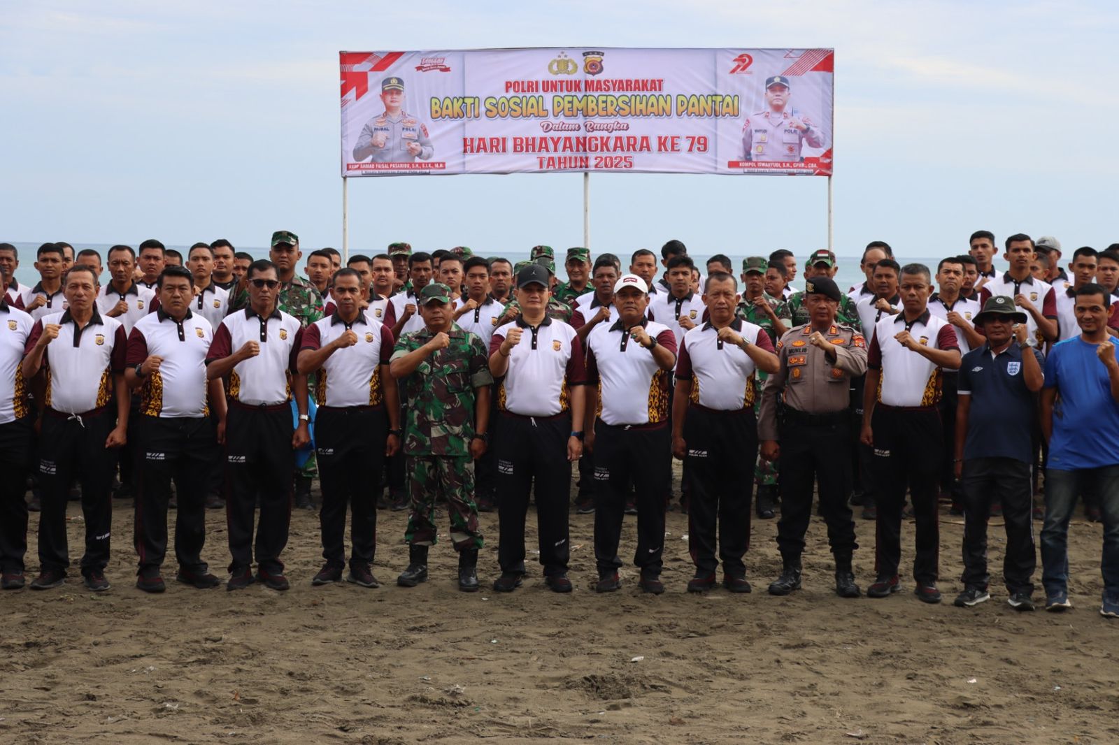 Peringati Hari Bhayangkara ke-79, Polres Pidie Jaya Gelar Aksi Bersih Pantai dan Baksos di Meureudu