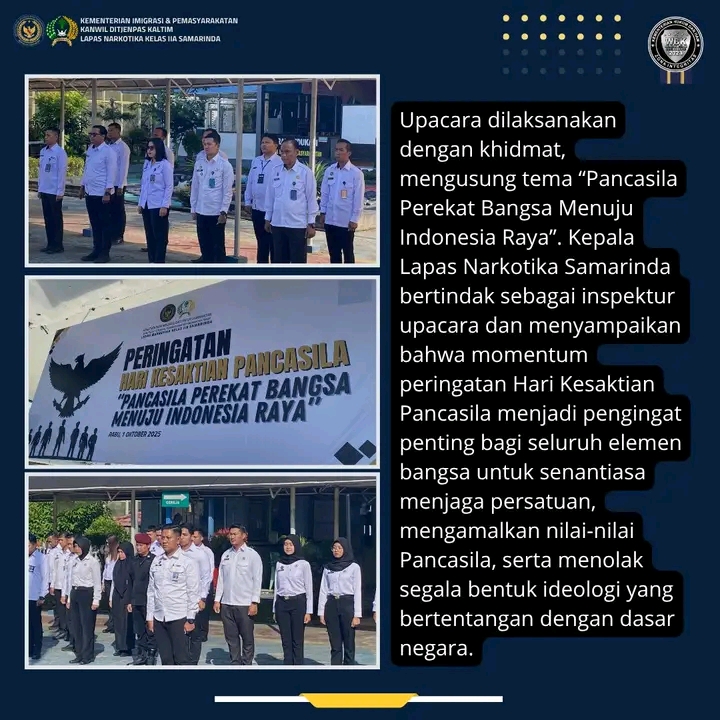 Upacara dilaksanakan dengan khidmat, mengusung tema “Pancasila Perekat Bangsa Menuju Indonesia Raya”. Kepala Lapas Narkotika Samarinda bertindak sebagai inspektur upacara dan menyampaikan bahwa momentum peringatan Hari Kesaktian Pancasila menjadi pengingat penting bagi seluruh elemen bangsa untuk senantiasa menjaga persatuan, mengamalkan nilai-nilai Pancasila, serta menolak segala bentuk ideologi yang bertentangan dengan dasar negara.