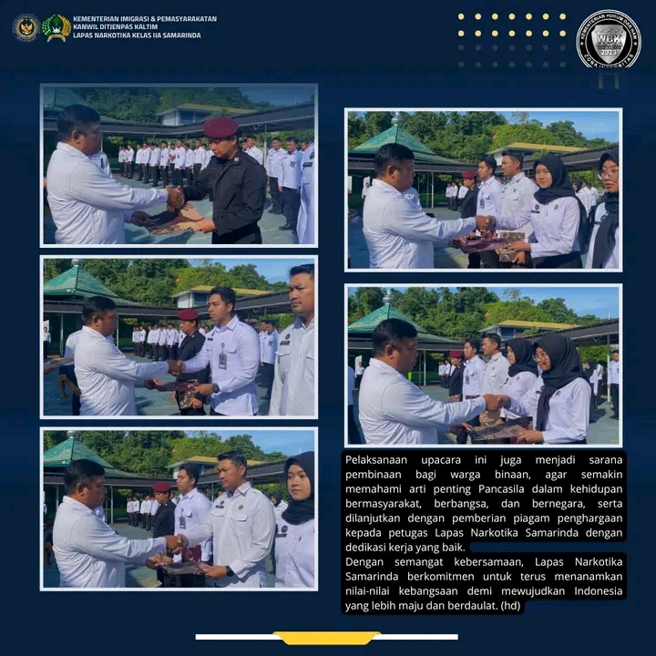 Pelaksanaan upacara ini juga menjadi sarana pembinaan bagi warga binaan, agar semakin memahami arti penting Pancasila dalam kehidupan bermasyarakat, berbangsa, dan bernegara, serta dilanjutkan dengan pemberian piagam penghargaan kepada petugas Lapas Narkotika Samarinda dengan dedikasi kerja yang baik.