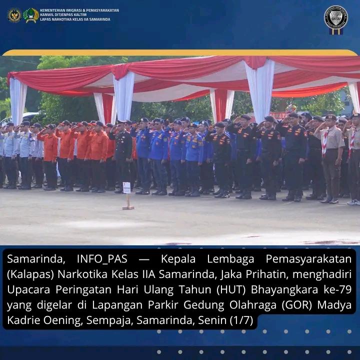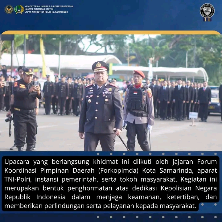 TIMELINES INEWS INVESTIGASI, Samarinda, Kepala Lembaga Pemasyarakatan (Kalapas) Narkotika Kelas IIA Samarinda, Jaka Prihatin, menghadiri Upacara Peringatan Hari Ulang Tahun (HUT) Bhayangkara ke-79 yang digelar di Lapangan Parkir Gedung Olahraga (GOR) Madya Kadrie Oening, Sempaja, Samarinda, Senin (1/7).