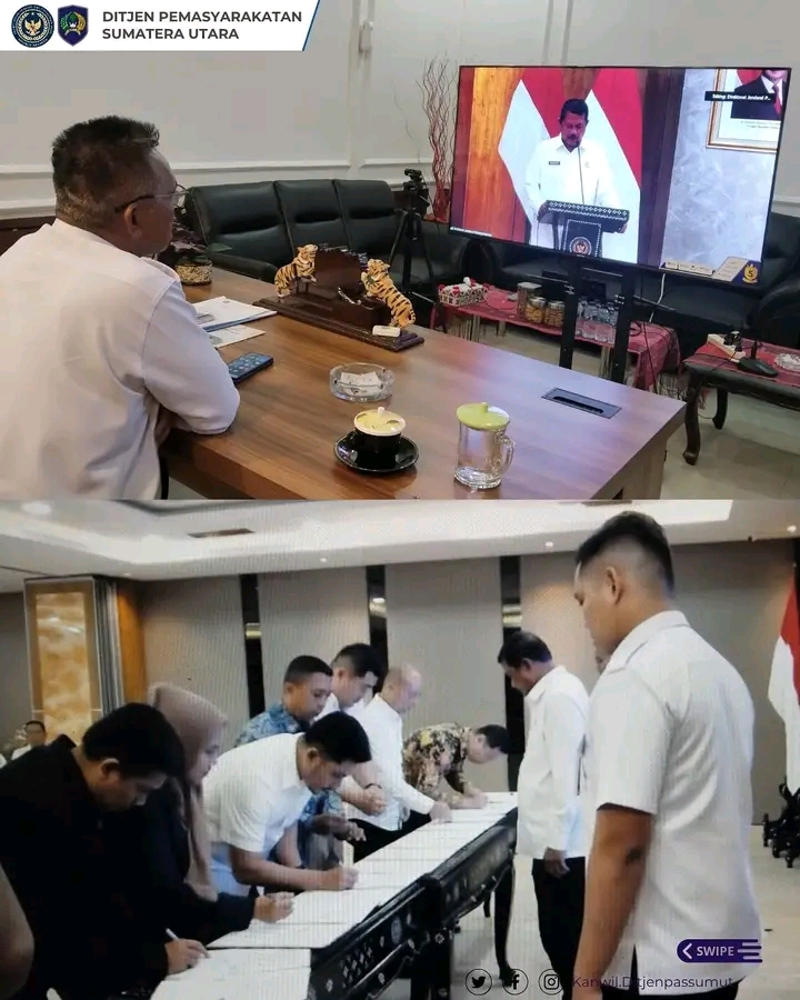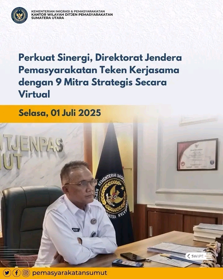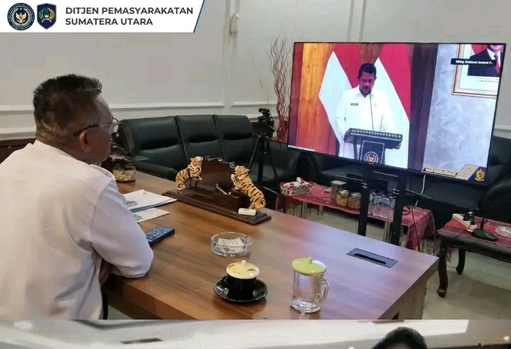 TIMELINES INEWS INVESTIGASI, Medan Kepala Kantor Wilayah Direktorat Jenderal Pemasyarakatan (Ditjenpas) Sumatera Utara, Yudi Suseno, mengikuti kegiatan penandatanganan naskah kerja sama antara Direktorat Jenderal Pemasyarakatan dengan sembilan mitra strategis yang dilaksanakan secara virtual pada Selasa (01/07).