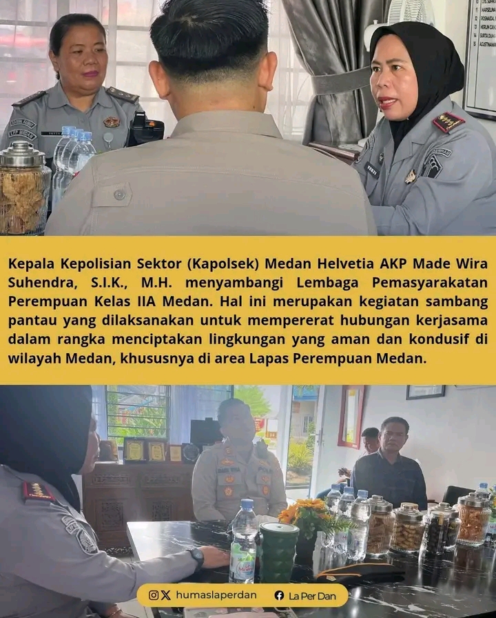 TIMELINES INEWS INVESTIGASI, Lapas Perempuan Medan Kepala Kepolisian Sektor (Kapolsek) Medan Helvetia AKP Made Wira Suhendra, S.I.K., M.H. menyambangi Lembaga Pemasyarakatan Perempuan Kelas IIA Medan. Hal ini merupakan kegiatan sambang pantau yang dilaksanakan untuk mempererat hubungan kerjasama dalam rangka menciptakan lingkungan yang aman dan kondusif di wilayah Medan, khususnya di area Lapas Perempuan Medan, Selasa (18/02/25)