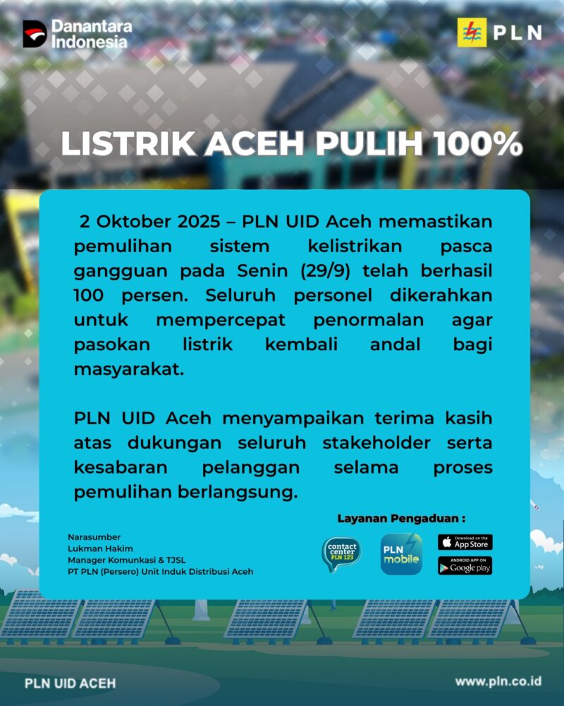 TLii.Banda Aceh, 2 Oktober 2025 – PT PLN (Persero) berhasil memulihkan kembali 100 persen sistem kelistrikan Aceh pada Kamis (2/10) pukul 00.07 WIB