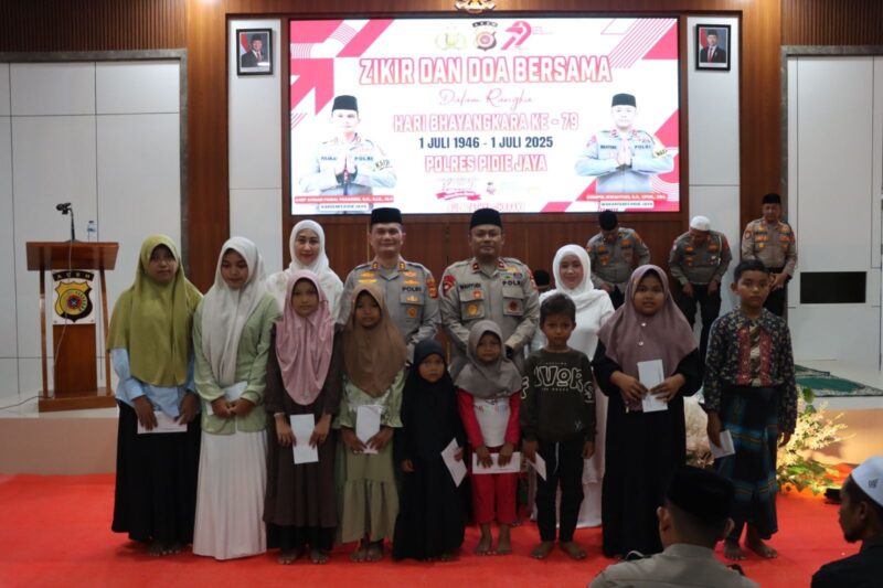 TLi.PIDIE JAYA – Memperingati Hari Bhayangkara ke-79, Polres Pidie Jaya mengadakan zikir dan doa bersama sekaligus aksi sosial bagi anak yatim dan fakir miskin. Kegiatan tersebut digelar di Aula Tathya Darakha Polres Pidie Jaya pada Sabtu (21/6/2025) sore, sebagai bentuk syukur dan kepedulian terhadap masyarakat.