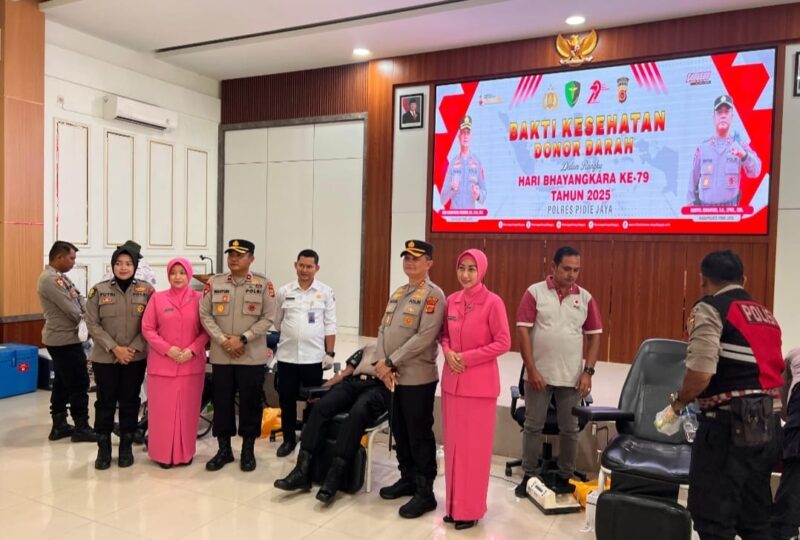 TIMELINESINEWS.COM [] PIDIE JAYA – Dalam rangka menyambut Hari Bhayangkara ke-79, Polres Pidie Jaya melalui Seksi Dokkes menggelar kegiatan donor darah, Jumat (20/6/2025) di Aula Tathya Dharaka. Kegiatan ini bekerja sama dengan PMI dan UTD RSUD Pidie Jaya.