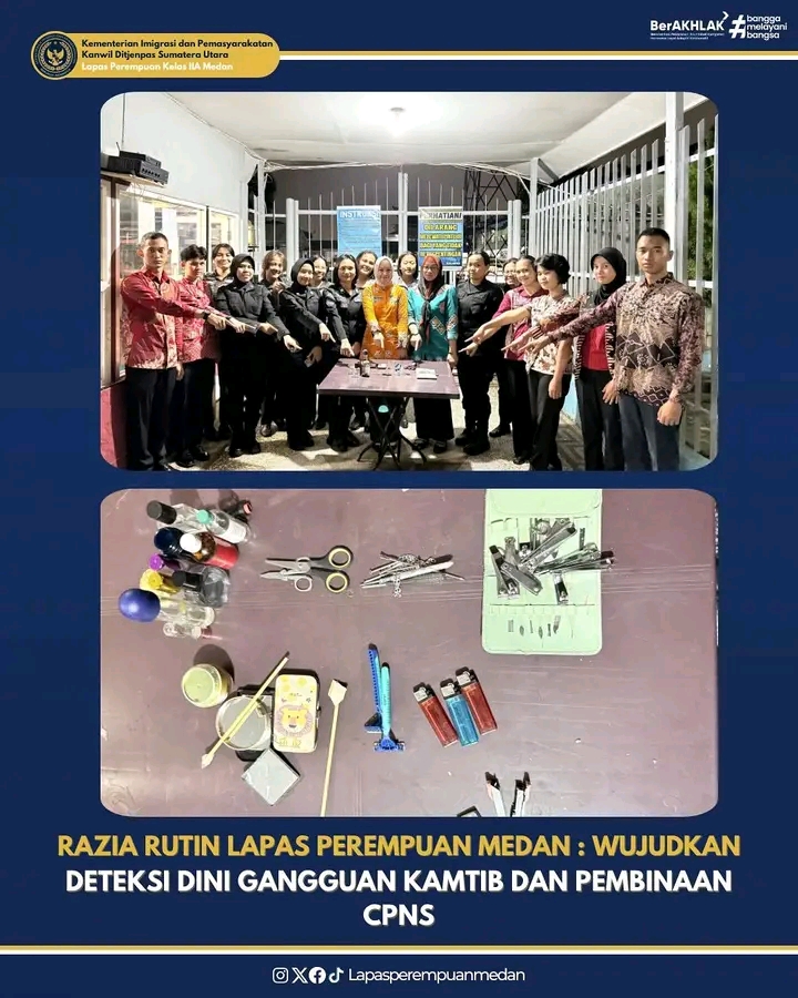 TIMELINES INEWS INVESTIGASI, Medan Dalam rangka menjaga stabilitas keamanan dan ketertiban serta mencegah potensi gangguan di dalam lembaga pemasyarakatan, Lapas Perempuan Kelas IIA Medan melaksanakan kegiatan razia rutin di blok hunian warga binaan, Minggu (13/07).