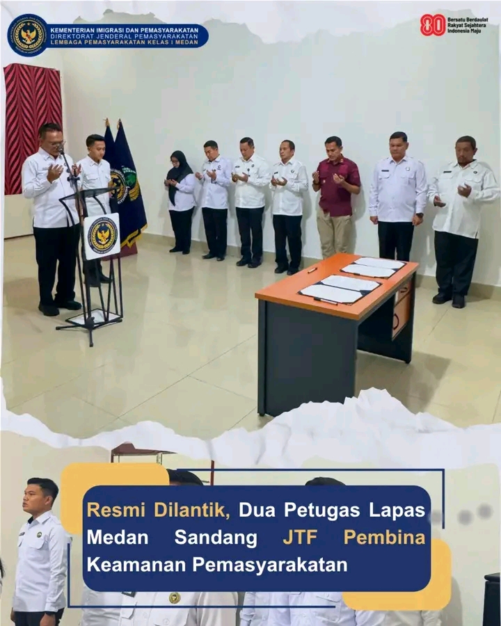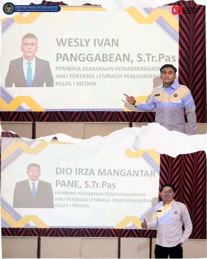 TIMELINES INEWS INVESTIGASI, Medan, 31 Juli 2025 Kabar membanggakan datang dari Lapas Kelas I Medan. Dua orang petugas, Dio Irza Mangantar Pane, S.Tr.Pas dan Wesly Ivan Panggabean, S.Tr.Pas, resmi dilantik sebagai Pejabat Fungsional Pembina Keamanan Pemasyarakatan Ahli Pertama.