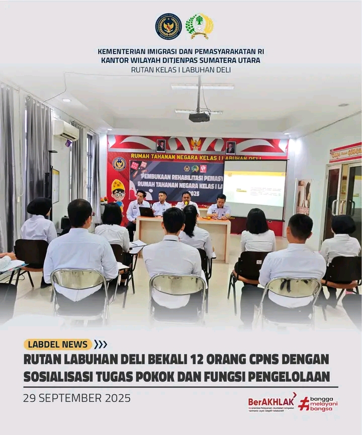 TIMELINES INEWS INVESTIGASI, Labuhan Deli Rumah Tahanan Negara (Rutan) Kelas I Labuhan Deli terus berkomitmen meningkatkan pemahaman dan profesionalitas pegawainya, khususnya bagi para Calon Pegawai Negeri Sipil (CPNS). Sebagai wujud nyata dari komitmen tersebut, Rutan Labuhan Deli menggelar kegiatan sosialisasi mengenai tugas pokok dan fungsi (tusi) pengelolaan yang berlangsung di Ruang Moralitas lantai 2, Senin (29/9/2025).