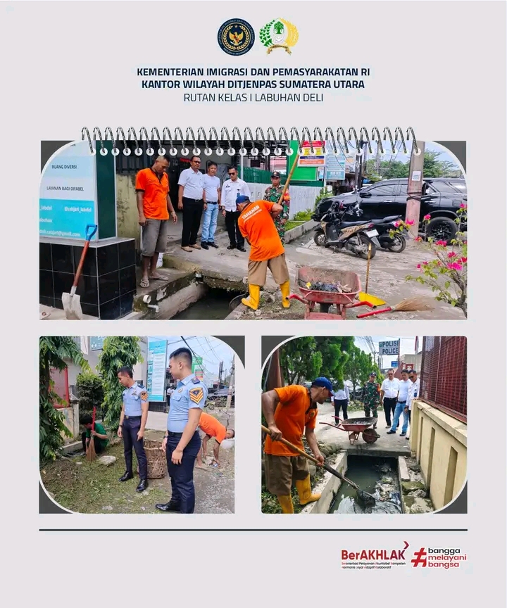 Kegiatan gotong royong ini dipimpin langsung oleh Kepala Rutan Kelas I Labuhan Deli, Eddy Junaedi, yang turut didampingi oleh Babinsa, Bhabinkamtibmas, Lurah, serta Kepling setempat. Selain petugas Rutan, aksi bersih-bersih ini juga melibatkan warga binaan pemasyarakatan (WBP) yang penuh semangat membersihkan parit dari sampah dan endapan yang menghambat aliran air.