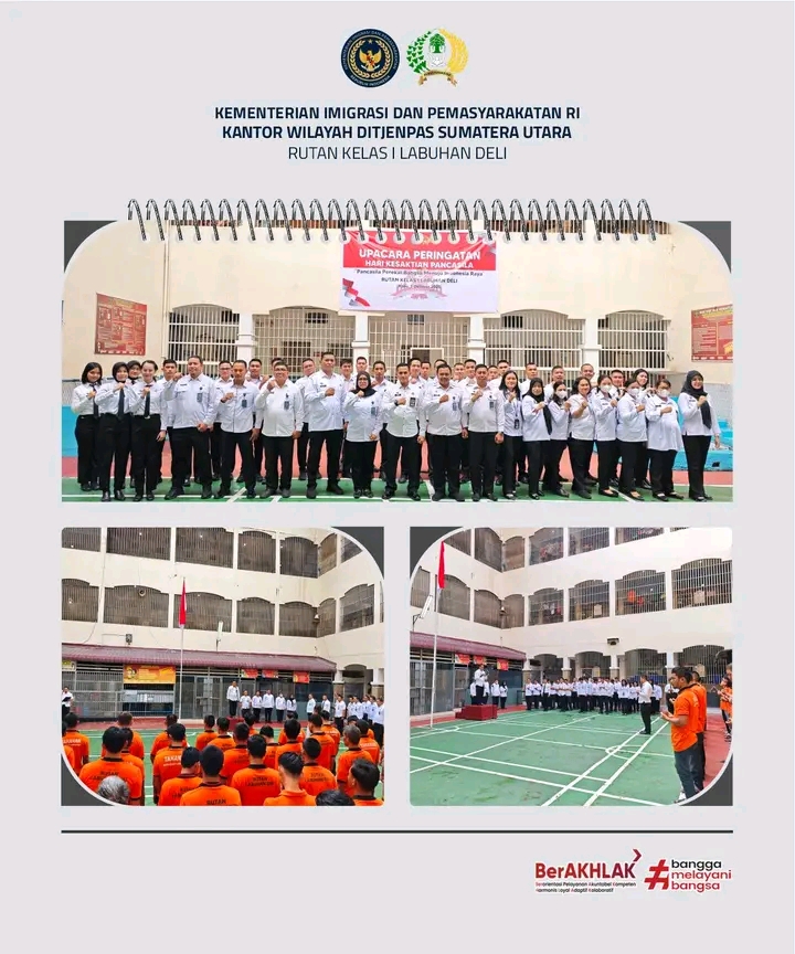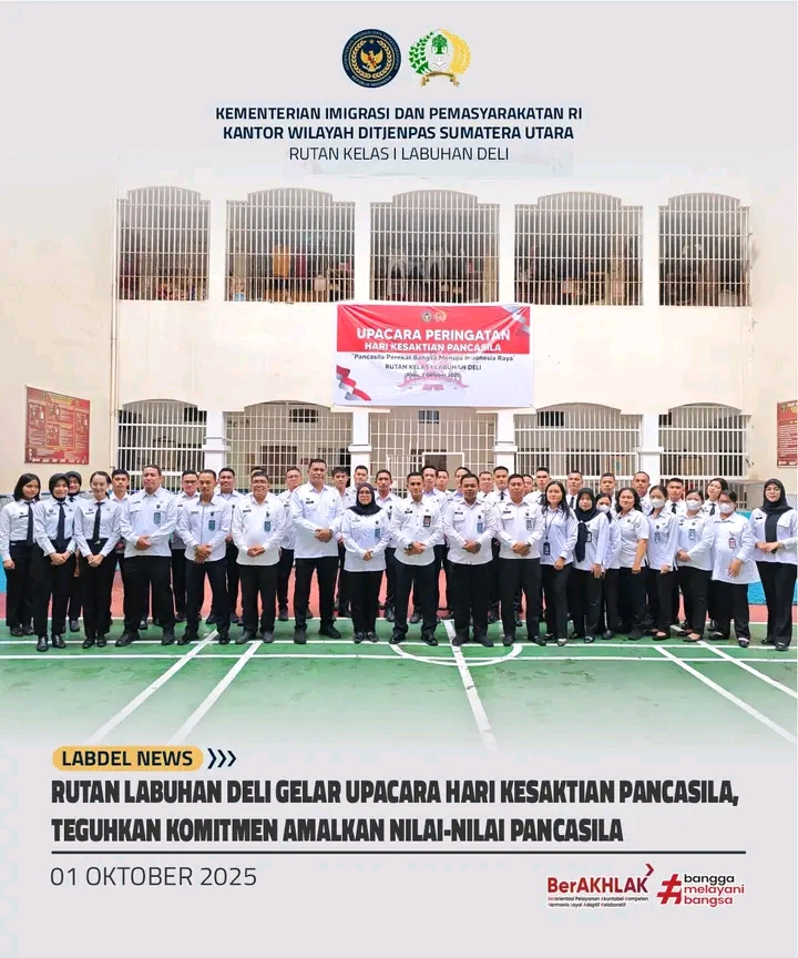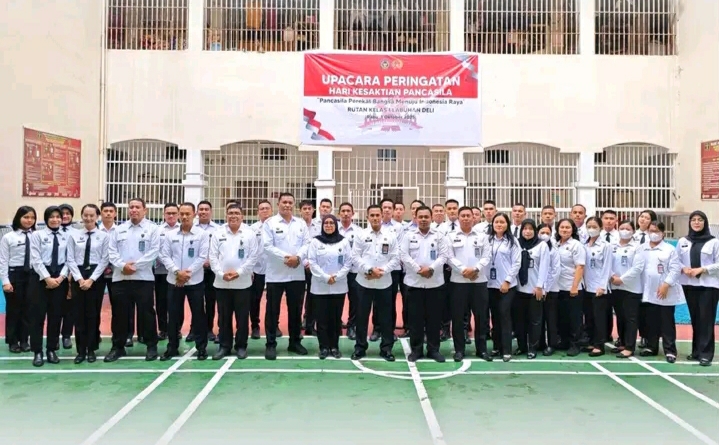 Tahanan Negara (Rutan) Kelas I Labuhan Deli melaksanakan upacara bendera dalam rangka memperingati Hari Kesaktian Pancasila yang jatuh pada 1 Oktober 2025. Upacara berlangsung khidmat di lapangan blok hunian Rutan dengan mengusung tema “Pancasila Perekat Bangsa Menuju Indonesia Raya.”