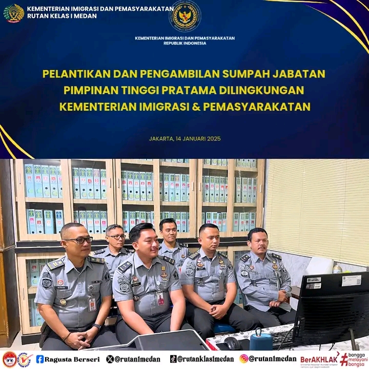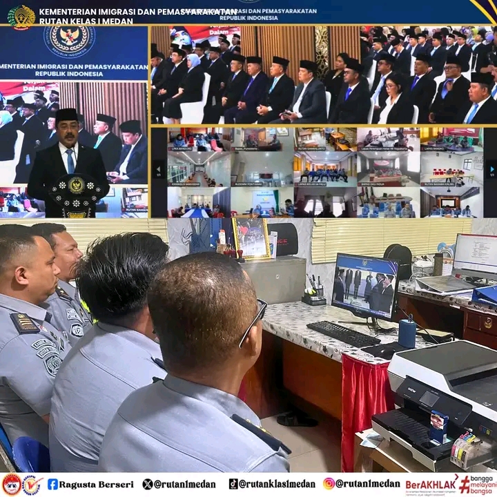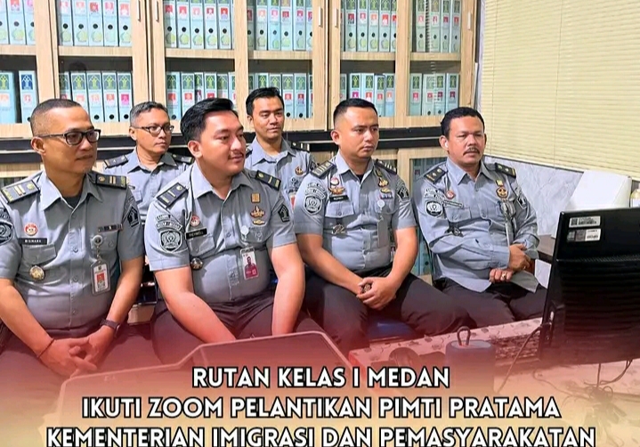 TIMELINES INEWS INVESTIGASI, Rutan Tanjung gusta Medan Rumah Tahanan Negara (Rutan) Kelas I Medan ikuti zoom Pelantikan dan pengambilan sumpah jabatan Pimpinan Tinggi (Pimti) Pratama di Lingkungan Kementerian Imigrasi dan Pemasyarakatan. Kegiatan ini diikuti oleh Kepala Seksi Pelayanan Tahanan (KasieYantah), Ronny Steven serta Pejabat Struktural dan Staff.