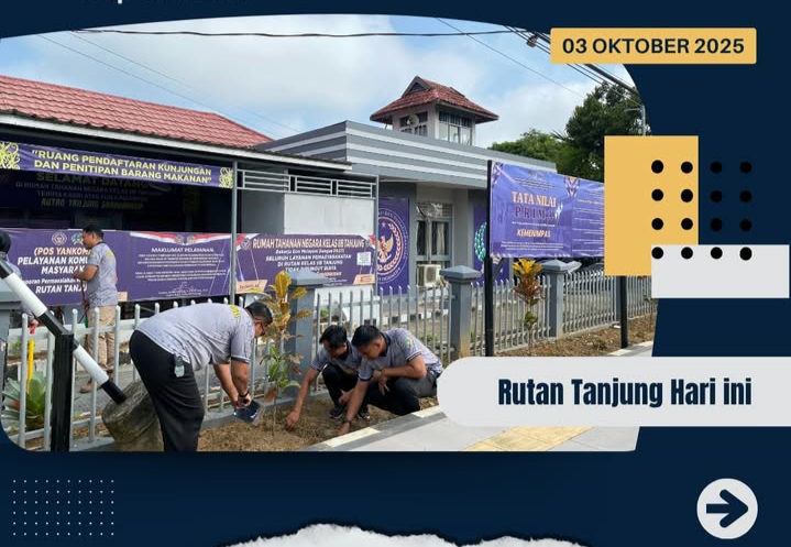 TIMELINES INEWS INVESTIGASI, Tanjung, 03 Oktober 2025 Rumah Tahanan Negara (Rutan) Kelas IIB Tanjung melaksanakan kegiatan Jum’at Berkah dengan menggelar gotong royong membersihkan halaman depan dan lingkungan sekitar rutan. Kegiatan rutin ini bertujuan untuk menjaga kebersihan serta menumbuhkan semangat kebersamaan antara petugas dan warga binaan.
