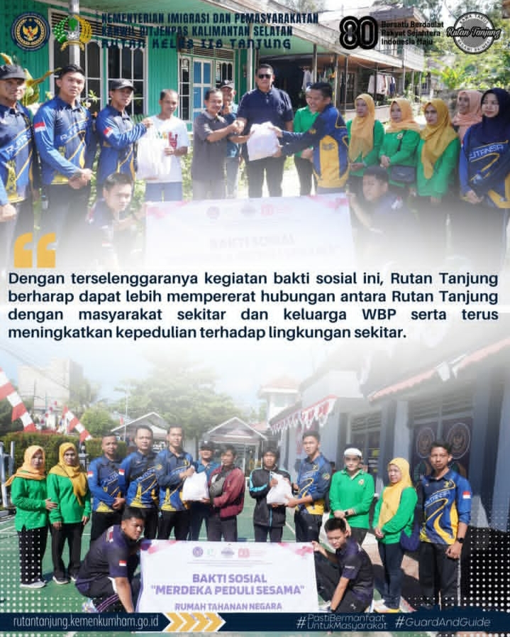 Usai jalan santai, acara dilanjutkan dengan pembagian bantuan sosial secara door to door kepada keluarga warga binaan pemasyarakatan (WBP) dan masyarakat sekitar yang membutuhkan.“Bakti sosial ini adalah wujud syukur kami atas Kemerdekaan RI ke-80, sekaligus bentuk kepedulian Rutan Tanjung kepada masyarakat sekitar dan keluarga WBP,” tambah Raymon.
