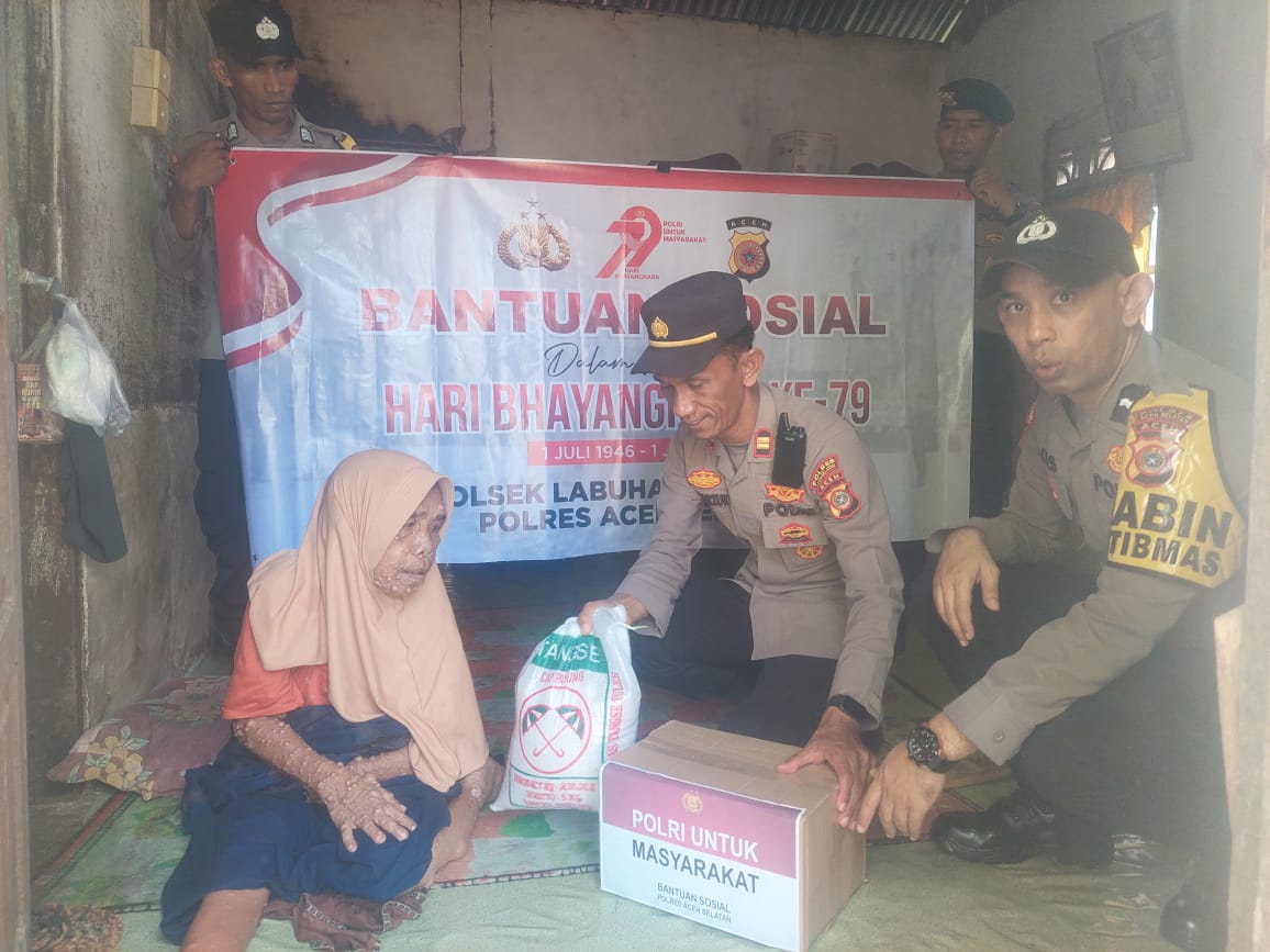 Sambut HUT Bhayangkara ke-79, Polsek Labuhanhaji Timur Salurkan Bansos kepada Warga Kurang Mampu