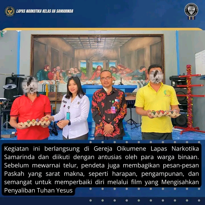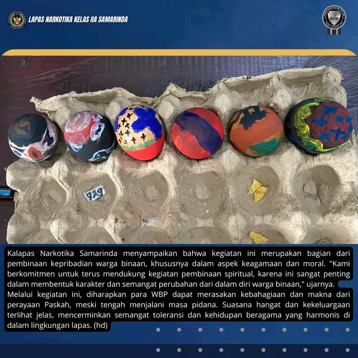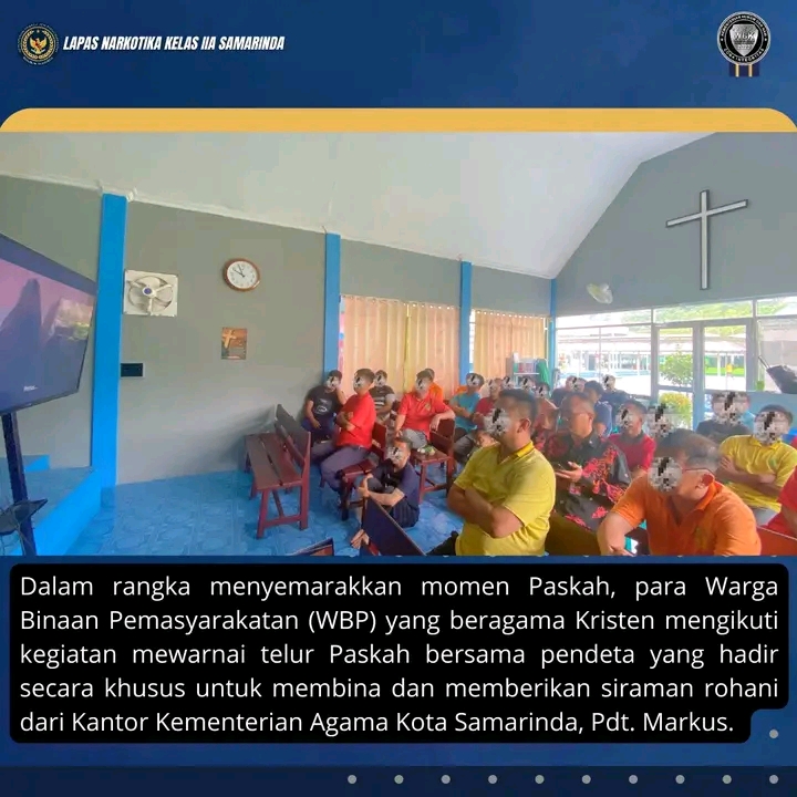 Kegiatan ini berlangsung di Gereja Oikumene Lapas Narkotika Samarinda dan diikuti dengan antusias oleh para warga binaan. Sebelum mewarnai telur, pendeta juga membagikan pesan-pesan Paskah yang sarat makna, seperti harapan, pengampunan, dan semangat untuk memperbaiki diri melalui film yang Mengisahkan Penyaliban Tuhan Yesus
