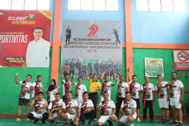 Tapaktuan – Dalam rangka memeriahkan Hari Ulang Tahun (HUT) Bhayangkara ke-79 tahun 2025, Polres Aceh Selatan Polda Aceh menggelar Kejuaraan Badminton “Kapolres Cup” yang melibatkan personel Polres dan Polsek jajaran. Kegiatan berlangsung meriah di Gedung Olahraga (GOR) PU Pemda Aceh Selatan dan secara resmi dibuka oleh Kapolres Aceh Selatan AKBP T. Ricki Fadlianshah, S.I.K., diwakili Wakapolres Aceh Selatan Kompol Edwin Aldro, S.H., M.H, Senin, 16 Juni 2025.