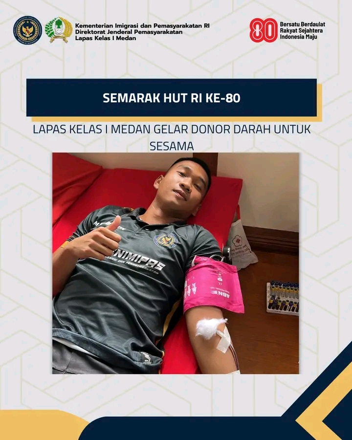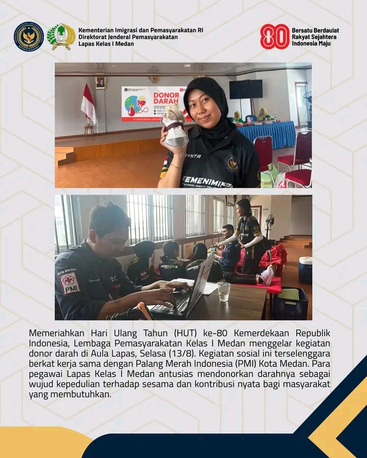 TIMELINES INEWS INVESTIGASI, Medan, Memeriahkan Hari Ulang Tahun (HUT) ke-80 Kemerdekaan Republik Indonesia, Lembaga Pemasyarakatan (Lapas) Kelas I Medan menggelar kegiatan donor darah di Aula Lapas, Selasa (13/8). Kegiatan sosial ini terselenggara berkat kerja sama dengan Unit Transfusi Darah (UTD) Palang Merah Indonesia (PMI) Kota Medan. Para pegawai Lapas Kelas I Medan antusias mendonorkan darahnya sebagai wujud kepedulian terhadap sesama dan kontribusi nyata bagi masyarakat yang membutuhkan.