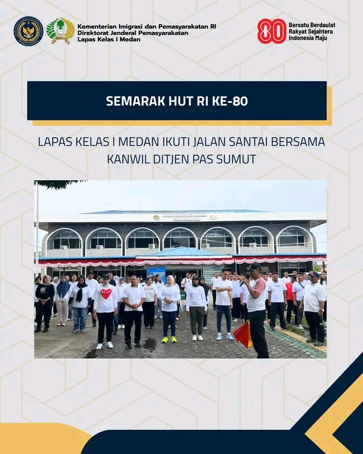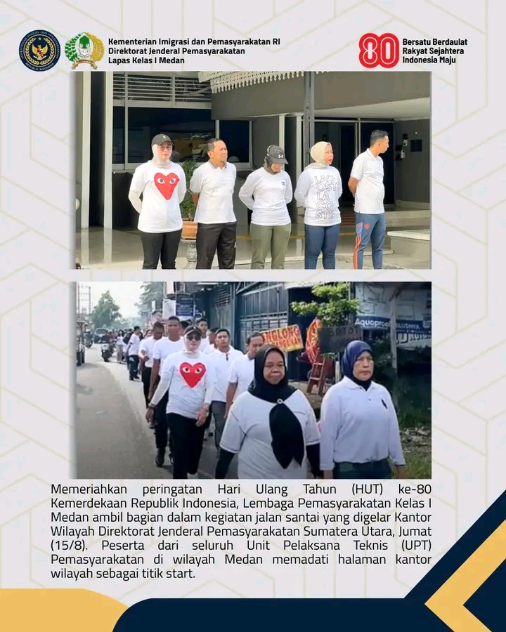 TIMELINES INEWS INVESTIGASI, Medan, Memeriahkan peringatan Hari Ulang Tahun (HUT) ke-80 Kemerdekaan Republik Indonesia, Lembaga Pemasyarakatan (Lapas) Kelas I Medan ambil bagian dalam kegiatan jalan santai yang digelar Kantor Wilayah Direktorat Jenderal Pemasyarakatan Sumatera Utara, Jumat (15/08).